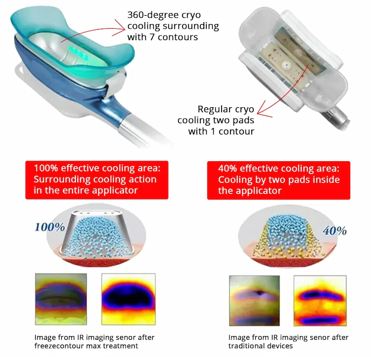 360 cryo angle es la última tecnología de enfriamiento para la eliminación de la celulitis grasa que utiliza la tecnología de enfriamiento envolvente de 360°, El sistema de enfriamiento puede alcanzar su temperatura objetivo más rápido que los modelos anteriores, maximizando la eficiencia del tiempo y la comodidad tanto para los pacientes como para los profesionales.